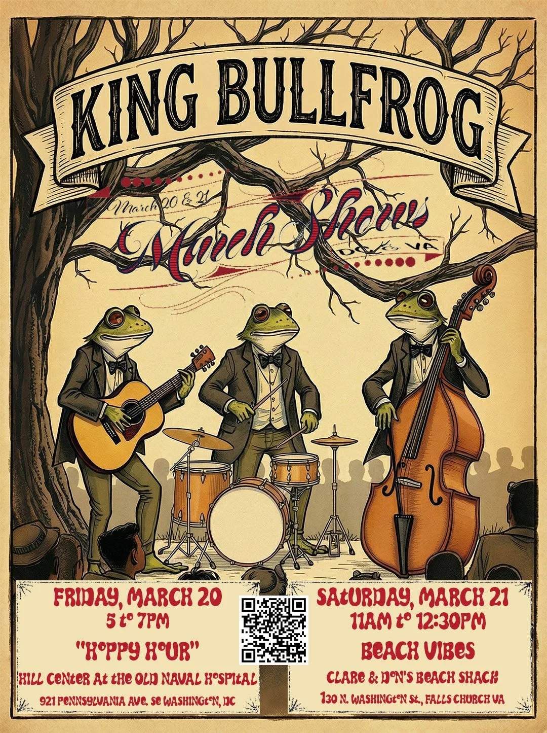 Saturday, May 2 11am • KING BULLFROG • Clare and Don’s Beach Shack 130 N Washington St, Falls Church, VA